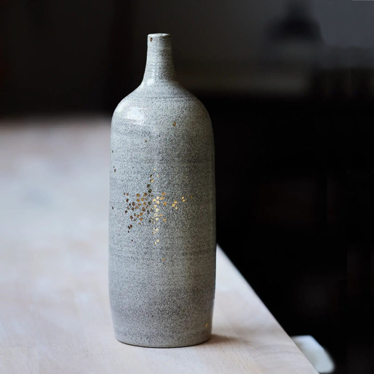 Caroline Guillot, artisane céramiste, apporte ici une touche très personnelle à son soliflore en grès gris avec l’incrustation d’or. Une touche d’élégance supplémentaire pour ce vase à la ligne minimaliste très contemporaine. Une création originale qui donnera du caractère à votre décoration intérieure. Chaque pièce est unique car tourné et émaillé à la main.