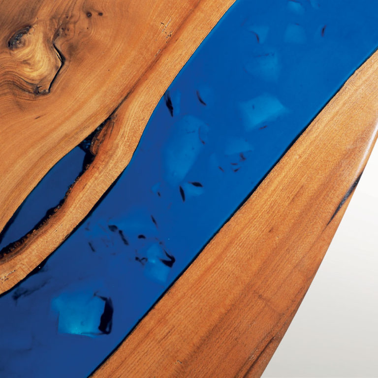 Table basse réalisée avec une sélection de belles essences de bois comme la loupe d’Orme ou le Noyer. Piétement métallique.